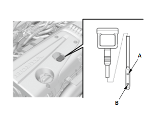 3- Retire la varilla y compruebe el nivel de aceite del motor. Debe estar entre la marca superior (A) y la marca inferior (B).